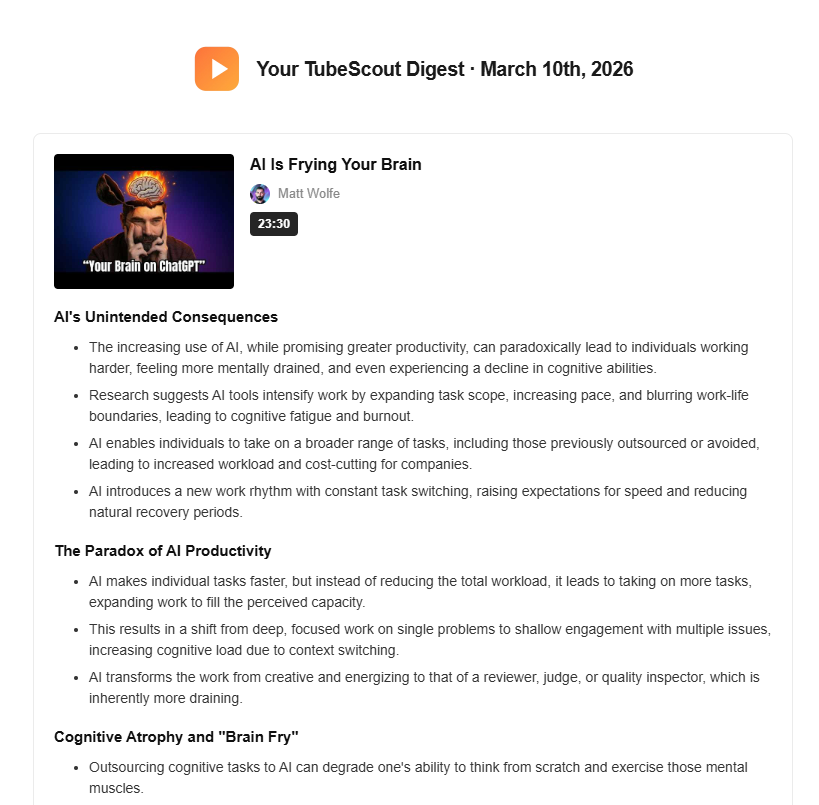 Each video distilled to its key takeaways. Know what's worth watching before you commit.
